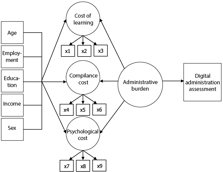 For psychological costs, the degree of agreement with the following statements about digital administration is used: “It promotes transparency in the administration” (x7), “It encourages citizen participation” (x8), “It makes procedures and inquiries difficult due to a lack of telephone and in-person support” (x9) (inverted). The variables are coded as follows: 1-Completely agree, 2-Agree somewhat, 3-Neither agree nor disagree, 4-Disagree somewhat, 5-Strongly disagree.