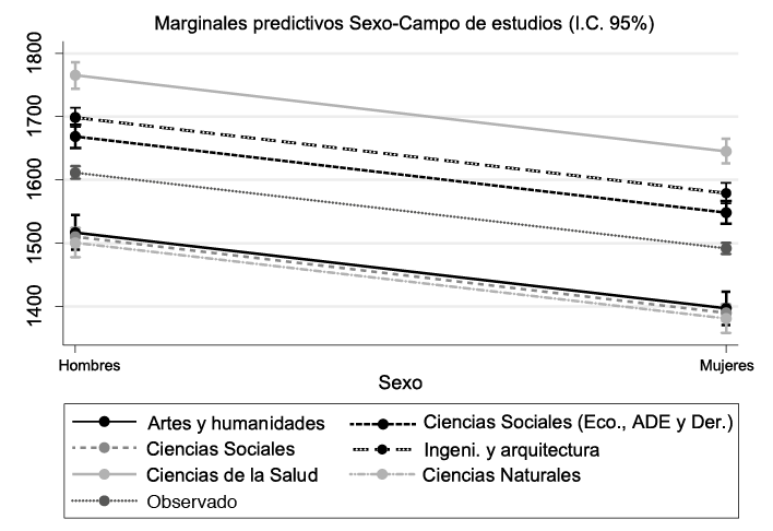 En primer lugar, los marginales predictivos para las variables sexo y campo de estudios presentados en el gráfico 1 establecen que los campos mejor pagados son los de ciencias de la salud, seguidos por los de ciencias sociales (Economía, ADE, Empresariales y Derecho) y por las ingenierías y la arquitectura. Los campos que menos ingresos perciben son los de las ciencias naturales, ciencias sociales, y artes y humanidades. A pesar de que estos campos siguen el mismo orden para hombres y mujeres, los marginales predictivos indican una clara desigualdad de género que posiciona siempre peor a las mujeres respecto a sus homólogos masculinos. Si nos fijamos específicamente, los hombres obtienen ingresos más altos en campos como las Artes y las Humanidades, el campo donde menos ingreso se percibe, que las mujeres que estudiaron ciencias sociales, ciencias naturales, y artes y humanidades. Asimismo, los hombres obtienen mayores ingresos con titulaciones en Ingeniería y Arquitectura que las mujeres en campos de ciencias de la salud (mejor pagados). Estos resultados pondrían en cuestión el discurso que alega que, para alcanzar la igualdad, las mujeres tengan que estudiar en campos de las conocidas como STEM (ciencias, tecnologías, matemáticas e ingenierías), ya que indistintamente del campo de estudios cursado por las mujeres, estas siempre percibirán menor ingreso que sus coetáneos masculinos.
