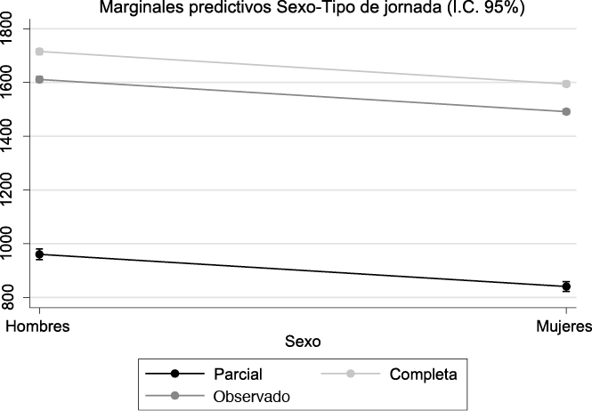Gráfico 2. Predicción lineal del ingreso para hombres y mujeres en función del tipo de jornada