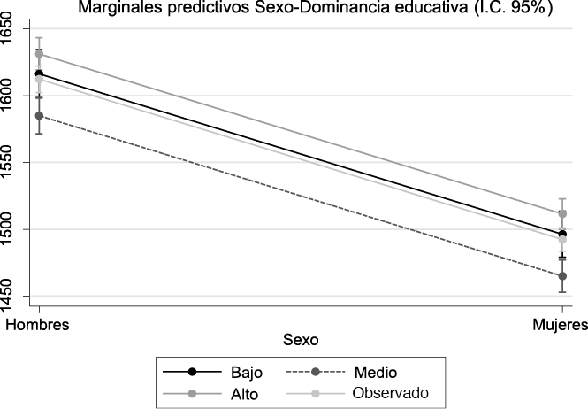 El gráfico 3 ilustra la interacción entre la dominancia educativa, que sirve como proxy de la clase social de origen, y el género en relación con los ingresos de las personas egresadas. Un hallazgo notable es que el género ocasiona muchas más diferencias en los ingresos que la clase social de origen. Independientemente de la clase social de origen, las mujeres siempre están por debajo de los hombres en términos salariales. Esto sugiere que las disparidades de género son una fuerza significativa y persistente que influye en la remuneración laboral. Además, se verifican las cortas distancias de ingresos entre clases (observadas en la regresión como diferencias no significativas). Esto queda reflejado en el hecho de que las personas egresadas que provienen de contextos sociales donde ambos progenitores tienen un nivel de estudios bajo están por encima de aquellos cuyos progenitores tienen un nivel de estudios medio. Se refuerza la tesis de la universidad un mecanismo de movilidad social ascendente para aquellos de orígenes socioeconómicos menos privilegiados (Fachelli, Torrents y Navarro-Cendejas, 2014).