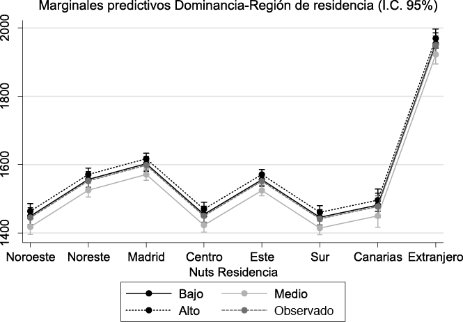 El gráfico 4 muestra la interacción entre la clase social y la región de residencia de los encuestados en relación con sus ingresos. Aunque las diferencias salariales son mínimas puede advertirse que la dominancia educativa y la región de residencia están asociadas con diferencias salariales. Es destacable que la desigualdad salarial está más vinculada al lugar de trabajo y de residencia que a la clase social de origen. Esto sugiere que otras variables, como la ubicación geográfica y el tipo de empleo, tienen un impacto aún mayor en las desigualdades salariales.