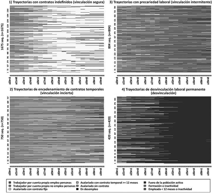 Los resultados del análisis de secuencias y de clústeres revelan cuatro tipos de trayectorias laborales. El primero agrupa trayectorias con contratos indefinidos (vinculación segura, 45,9 %), el segundo refleja un encadenamiento de contratos temporales (vinculación incierta, 20,6 %), el tercer muestra trayectorias de precariedad laboral (vinculación intermitente, 22 %) y, por último, el cuarto grupo es el de trayectorias de desvinculación laboral permanente (desvinculación, 11,5 %).