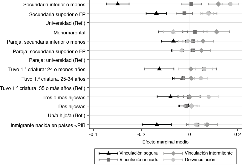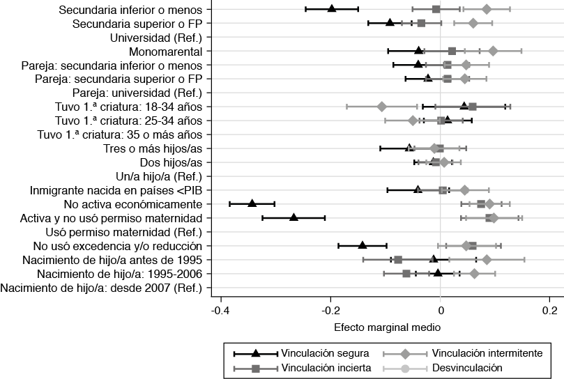La figura 2 muestra los resultados del primer modelo. Se constata que las madres con trayectorias laborales inciertas, por concatenar contratos temporales de larga duración, son las que menos se distinguen de las que tienen trayectorias seguras respecto a los factores analizados, como muestra su posicionamiento alrededor del 0 en el eje horizontal para casi todas las variables independientes. También se destaca que las mayores diferencias, entre 7 y 30 puntos porcentuales de media (0.3 en el eje equivale a 30pp), van ligadas a los recursos educativos de las madres. Comparado con las madres «universitarias», las madres con un «nivel educativo de secundaria inferior o menos» muestran una significativamente menor probabilidad media de haber tenido una vinculación segura (-30pp) y una mayor probabilidad media de haber tenido una trayectoria de vinculación intermitente (12pp) o de desvinculación laboral (17pp). Las de «secundaria superior o FP» no muestran tantas diferencias con las «universitarias» en su grado de vinculación laboral; no obstante, ellas tienen una probabilidad media menor de vinculación segura (14pp) y una probabilidad media mayor (8pp) de haberse desvinculado o haber tenido una vinculación intermitente. El nivel educativo de la pareja influye menos en las trayectorias laborales de las madres, particularmente si la pareja tiene «estudios de secundaria inferior o menos», ellas tienen una menor probabilidad de haber tenido una trayectoria de vinculación segura (-7pp) y una mayor probabilidad media de haber tenido una trayectoria intermitente (6pp), comparado con las que tenían parejas «universitarias». Esta trayectoria de vinculación intermitente también es más probable entre las madres que tienen una pareja con un nivel educativo de «secundaria superior o FP» (5pp) y más aún entre las madres que son monomarentales (11pp), comparado con las madres emparejadas con un «universitario». A su vez, hay otros eventos en el ciclo familiar que pueden marcar las trayectorias laborales de forma significativa. Uno de ellos es el «nacimiento de la primera criatura con veinticuatro años o menos», el cual disminuye la probabilidad media de vinculación segura (-12pp) y aumenta la probabilidad de desvinculación laboral (6pp) frente a una «primomaternidad tardía con 35 o más años». Tener tres o más criaturas también disminuye la probabilidad media de vinculación segura (-8pp) y aumenta la probabilidad media de desvinculación laboral (8pp), comparado con haber tenido «una única criatura». No aparecen diferencias significativas entre el número de hijos/as y los demás tipos de trayectorias laborales cuando se controla por el nivel educativo, como en este modelo. «Haber nacido en un país extranjero con un PIB per cápita inferior» al de España también reduce bastante la probabilidad media de haber conseguido una vinculación laboral segura, comparado con las «nativas y extranjeras similares» (-14pp). Empero, su efecto medio es menor que tener una «educación secundaria inferior o menos» (-30pp). A este respecto, seguramente hay inmigrantes que compensan las desventajas que implica la migración con niveles educativos altos u otros recursos personales relevantes.