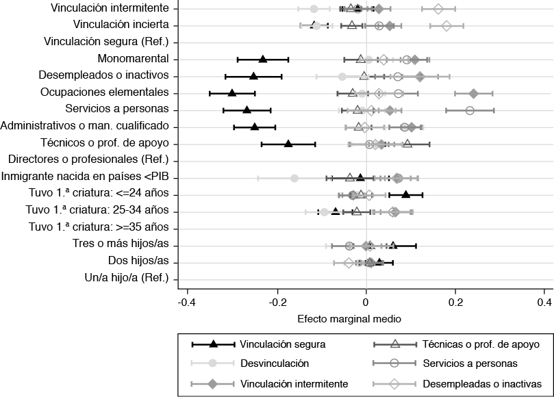 Los resultados del análisis de regresión multinomial se presentan en términos de efectos marginales medios con un intervalo de confianza del 95 % (figuras 2, 3 y 4). Los dos primeros modelos de regresión multinomial tienen los clústeres de las trayectorias laborales como variable dependiente. Se ha elegido a las madres con trayectorias laborales continuas y relación contractual segura (vinculación segura) como categoría de referencia, porque nos interesa conocer las características de las madres que muestran menores probabilidades de haber mantenido el empleo a lo largo de los veinte años de observación.