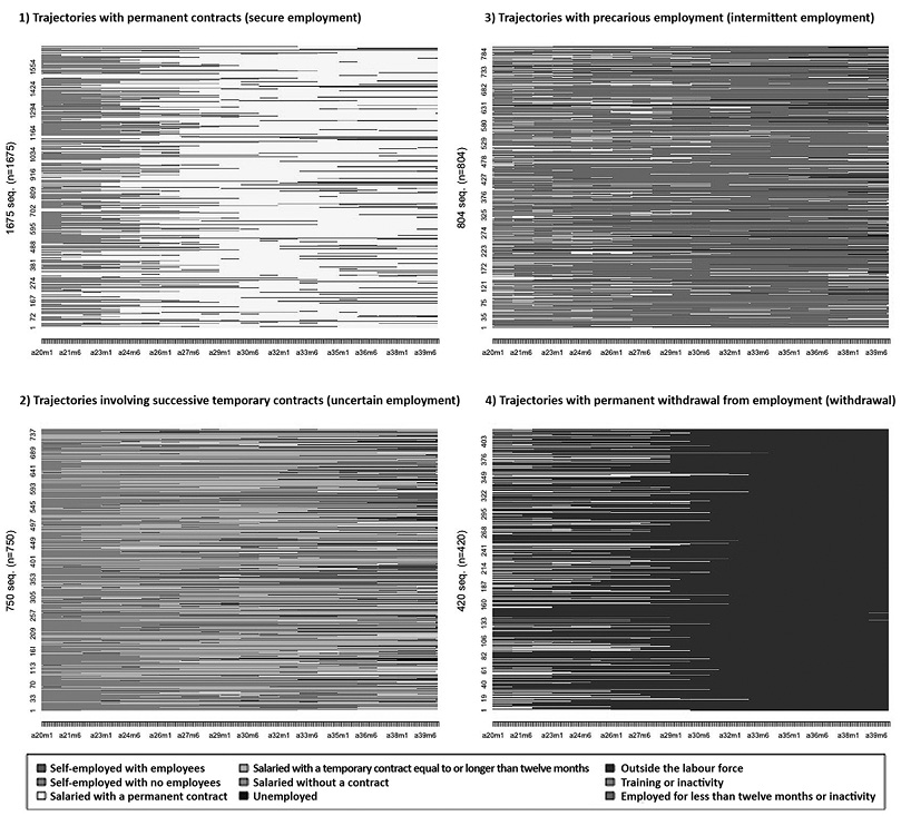 The results of the sequence and cluster analysis revealed four types of employment trajectories. The first group included trajectories with permanent contracts (“secure employment”, 45.9 %), the second reflected a chain of temporary contracts (“uncertain employment”, 20.6 %), the third showed trajectories of job insecurity (“intermittent employment”, 22 %) and the fourth group was characterised by trajectories of permanent withdrawal from employment (“withdrawal from employment”, 11.5 %).