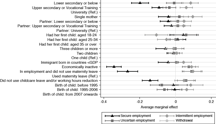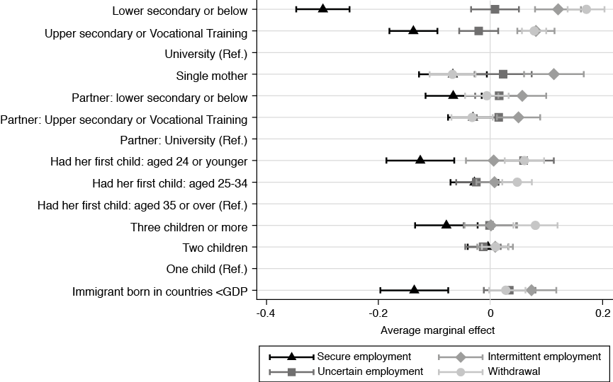 Note: The average marginal effect represents the predicted probability of having a given characteristic in relation to secure employment, intermittent employment, uncertain employment or withdrawal from employment, according to this model and the mean of the predictions across all cases, without altering the observed values of the other independent variables.