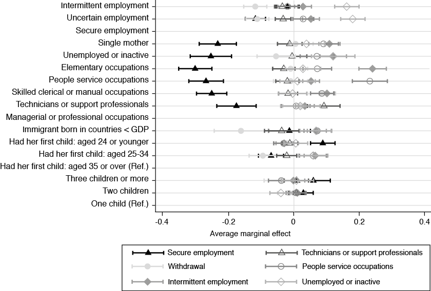 The results of the multinomial regression analysis are presented in terms of mean marginal effects with a 95 % confidence interval (Figures 2, 3 and 4). The first two multinomial regression models included the clusters of employment trajectories as the dependent variable. Mothers with continuous employment trajectories and a secure contractual relationship (secure employment) were chosen as the reference category, because we were interested in the characteristics of mothers who were less likely to have maintained employment over the twenty years of observation.