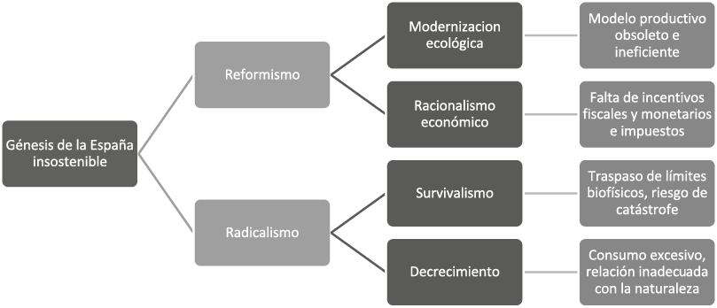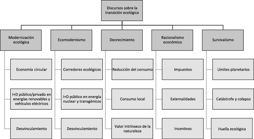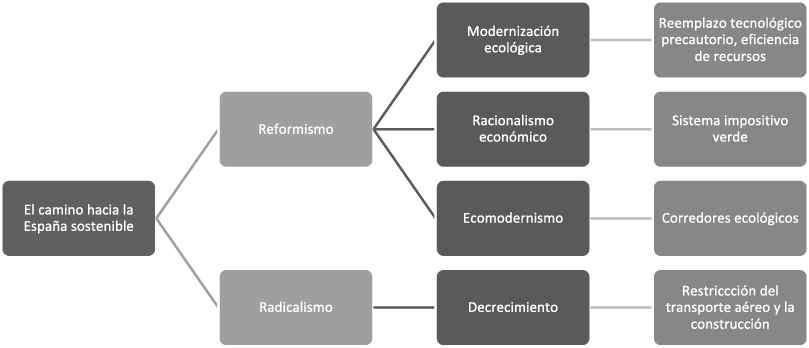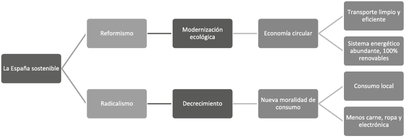 A pesar de que el survivalismo sería el juez ecológico último de las políticas medioambientales españolas, la agenda de transición ecológica está copada por el discurso reformista de la modernización ecológica. Esta se encuentra asistida por el racionalismo económico y algunos elementos decrecentistas; prueba de ello es que el objetivo de transición consiste en la construcción de una economía circular que será respetuosa de los límites ambientales gracias a un sistema robusto de incentivos económicos, a cambios en los hábitos de consumo de bienes y servicios y al desmantelamiento progresivo del sector de la construcción (véase figura 3).