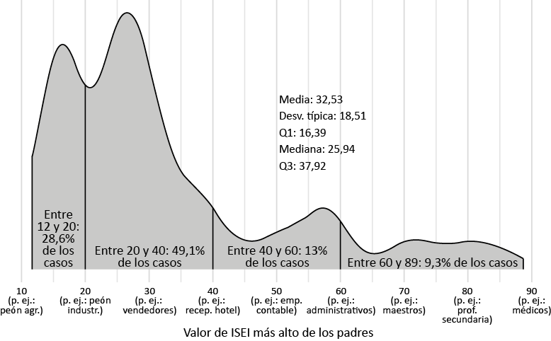 En primer lugar, el ISEI (Ganzeboom y Treiman, 1996) es un indicador de escala que refleja de manera precisa las variaciones en el estatus socioeconómico dado que se basa en los niveles promedio de educación e ingresos de las ocupaciones (Ganzeboom, 2010). Para adaptar este indicador a la base de datos –ya que, originalmente, usaba la clasificación internacional de ocupaciones ISCO08– se ha utilizado la CNO11 a tres dígitos a partir de la adaptación que realizan Bernardi y Ares (2017) para España.