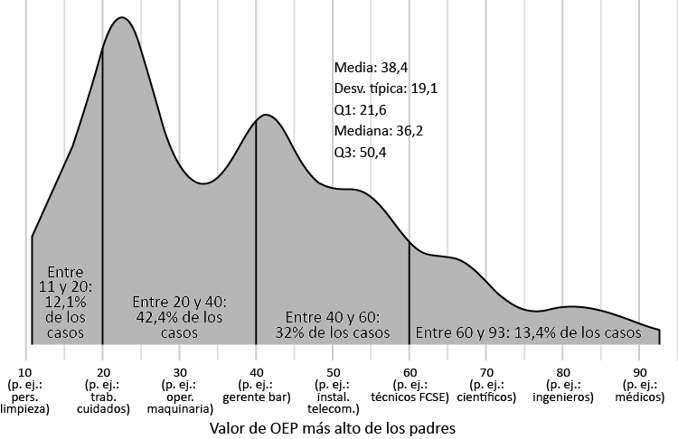 A fin de conseguir un valor único tanto de ISEI como de OEP para el conjunto de la unidad familiar de origen, se toma el valor superior entre los de ambos progenitores o aquel que estuviera disponible, en el caso de solo haber uno. En todo caso, el dato se refiere al momento en el que la persona entrevistada tenía quince años. Las figuras 1 y 2 muestran la distribución de ambas variables para la muestra final. Se puede comprobar rápidamente como el indicador OEP (Oesch et al., 2024) tiene una distribución más amplia (sobrepasa los 90 puntos) y menos sesgada a la izquierda. Un 25 % de los progenitores de las personas entrevistadas superan el valor intermedio (50) de la escala de OEP, mientras que, en el caso del ISEI, el tercer cuartil se sitúa por debajo de 40.
