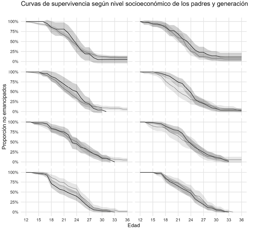 Antes se ha mencionado que el proceso de posicionamiento social de la juventud suele tener un efecto distinto sobre la emancipación al que tiene su clase social de origen. En un segundo grupo de modelos, se va a comprobar cuál es este efecto y si cambia a lo largo de las generaciones. De nuevo, los modelos se muestran en el anexo y aquí solo se expondrán las estimaciones de las curvas de supervivencia procedentes de la predicción marginal de los modelos.