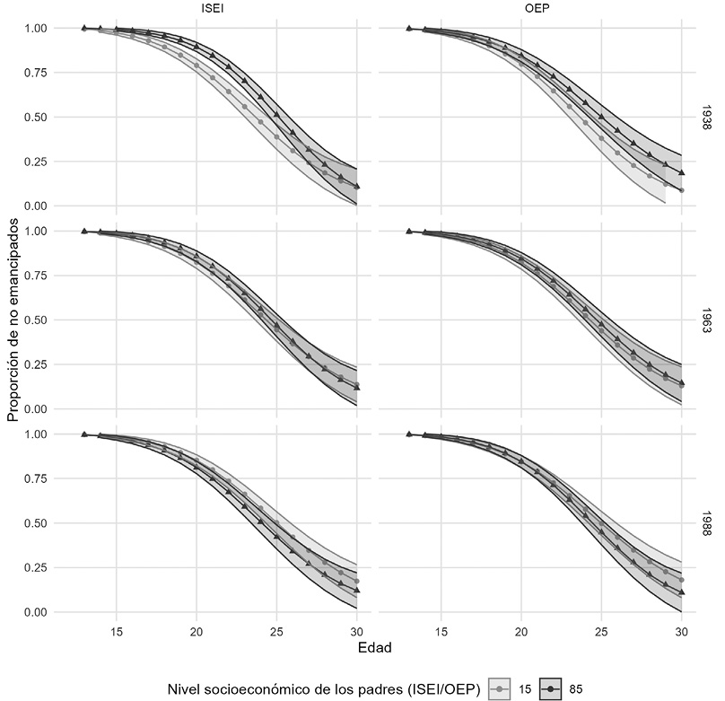 Como muestran las estimaciones de la figura 6 y la tabla 2, el efecto del propio proceso de enclasamiento sobre el proceso de emancipación es mucho más estable a lo largo de las generaciones que el de los progenitores: para todas las cohortes de nacimiento, aquellas personas que han conseguido una posición socioeconómica más elevada han experimentado una emancipación más tardía que quienes tienen una menor posición. Hay que señalar, sin embargo, que, si se mide la clase social mediante el OEP en lugar de mediante el ISEI, los datos parecen apuntar a una reducción de las desigualdades asociadas al propio proceso de enclasamiento en la emancipación: si en 1938 la diferencia era de 13,2 puntos porcentuales, en 1988 se habría reducido a 3,4. La diferencia habría venido básicamente por la parte de los jóvenes con posiciones de clase baja, que habrían asimilado así sus trayectorias de emancipación a los jóvenes con una buena posición de clase adquirida, sin que estos hubieran cambiado su pauta. Sin embargo, el test de Wald en este caso no proporciona evidencia estadística suficiente para afirmar que el efecto de la propia clase social haya cambiado de forma significativa.