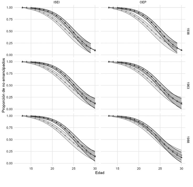 La figura permite comprobar cómo, efectivamente, el efecto de la clase parental sobre la emancipación ha cambiado a lo largo de las generaciones: para los nacidos antes de 1964 (y, en el caso del OEP, también los nacidos antes de 1975), una mayor clase social de origen retrasaba la emancipación respecto de quienes tenían un menor nivel. Para los nacidos a partir de 1975, no obstante, el efecto cambia de signo claramente en el caso de ambos indicadores, aunque más claramente en el caso del ISEI. El OEP no muestra una diferencia tan marcada, pero el cambio de tendencia respecto a generaciones anteriores es evidente. Estas diferencias son especialmente visibles entre los dieciocho y los veinticinco años y se reducen en edades más avanzadas.