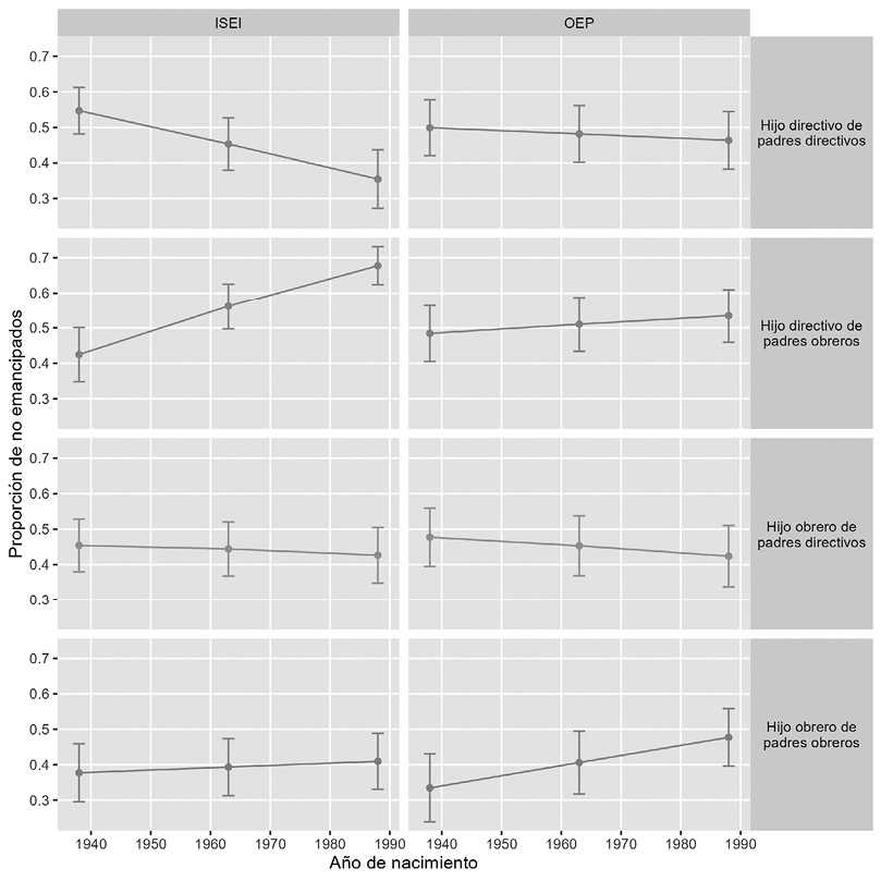 Finalmente, se ha comprobado cómo los efectos de la clase social de origen y de la posición propia interactúan, pero esta interacción cambia según el indicador de nivel socioeconómico considerado. Se podría apuntar, como interpretación tentativa, que el indicador OEP, que prioriza en exclusiva los ingresos potenciales como medidor de la clase, es más sensible al retraso de la emancipación de la juventud de clase trabajadora que no logra movilidad social ascendente, precisamente aquella que tendrá un nivel de ingresos inferior. Por su parte, el ISEI, que considera las diferencias de cualificación entre las diferentes ocupaciones en su medición de la clase social, coloca en una peor posición a la juventud de clase trabajadora que ha experimentado movilidad social ascendente y, por tanto, que ha atravesado un proceso de acumulación de capital humano más costoso, sin una posición familiar ventajosa.
