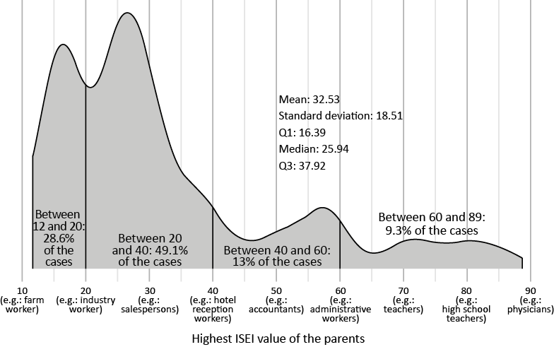 First, the ISEI (Ganzeboom and Treiman, 1996) is a scale indicator that accurately reflects variations in socioeconomic status. It is based on the average levels of education and income of occupations (Ganzeboom, 2010). To adapt this indicator to the database –since it originally used the ISCO-08 international standard classification of occupations– the three-digit CN011 has been used, based on the adaptations made by Bernardi and Ares (2017) for Spain.