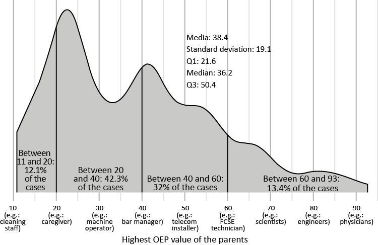 In order to obtain a single value for both ISEI and OEP for the entire family unit of origin, the higher value of those of both parents is taken, or the one that is available (if there is only one). In any case, the data refers to the time when the interviewee was fifteen years old. Figures 1 and 2 show the distribution of both variables for the final sample. It may be quickly verified that the OEP indicator (Oesch et al., 2024) has a wider distribution (exceeding 90 points) and is less left-leaning. A total of 25 % of the parents of the interviewed people exceed the intermediate value (50) of the OEP scale, whereas, in the case of the ISEI, the third quartile is below 40.