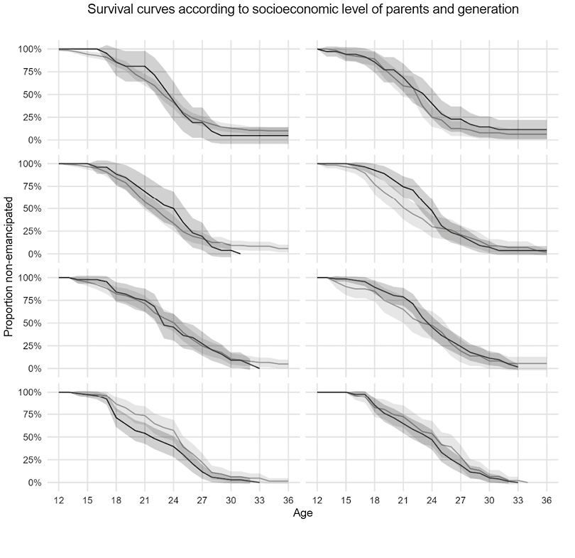 It was previously mentioned that the process of social positioning of young people often has a different effect on emancipation as compared to their social class of origin. In a second group of models, we will examine this effect and whether it changes across generations. Again, the models are shown in the appendix. In this section only the estimates of the survival curves derived from the marginal prediction of the models are presented.