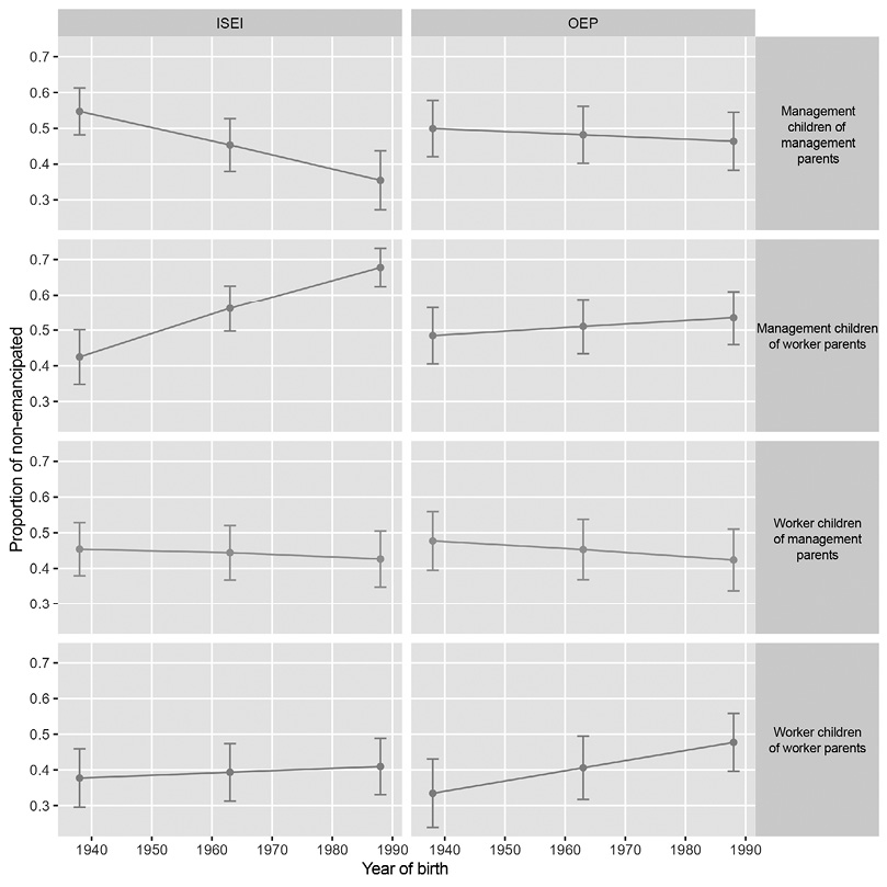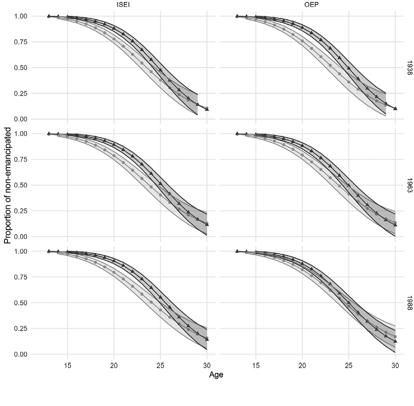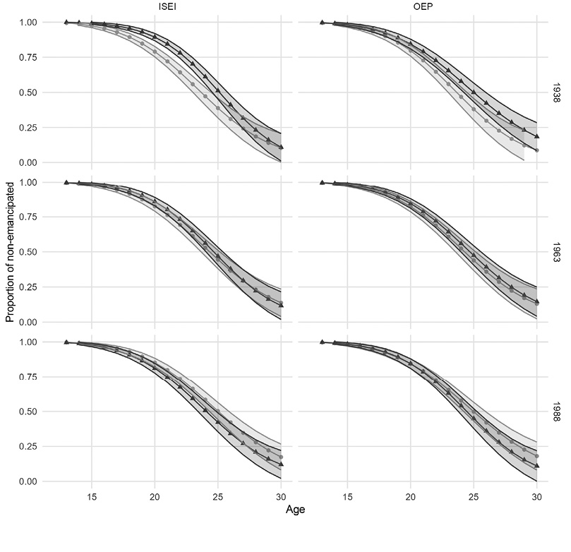 As the estimates in Figure 6 and Table 2 show, the effect of the own social class positioning process on the emancipation process is much more stable across generations than that of the parents. For all birth cohorts, those who attained a higher socioeconomic position experienced later emancipation as compared to those having a lower position. However, it should be noted that if social class is measured using the OEP instead of the ISEI, the data appear to show a reduction in inequalities associated with the class-building process itself during emancipation. While in 1938 the difference was of 13.2 percentage points, in 1988 it had decreased to 3.4. The difference would have come mainly from young people in lower socioeconomic backgrounds, who would have assimilated their emancipation trajectories to those of young people having a higher socioeconomic status, without the latter changing their own patterns. However, in this case, the Wald test does not provide sufficient statistical evidence to conclude that the effect of social class itself has changed significantly.