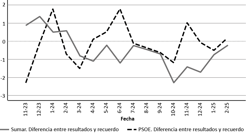 El PSOE tiene un recuerdo de voto de 31,2 sobre censo; tuvo 20,9 sobre censo, es decir, 10,3 puntos de sobrerrepresentación. […] Sumar: de 11,6, 3,5 puntos de sobrerrepresentación. […] Hay una sobrerrepresentación de casi quince puntos respecto al voto de la izquierda, recuerdo de voto, frente a la derecha (2025: 6).