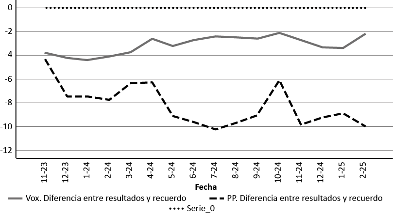 En las dos variables se ha interpolado el valor de agosto imputando el valor medio de los valores adyacentes al valor perdido. Los datos referidos al recuerdo de voto corresponden con las personas entrevistadas que afirman haber participado en las elecciones generales de julio de 2023, con la finalidad de evitar el efecto double barreled que genera la variable compuesta «recuerdo de voto + recuerdo de participación» (Alaminos, 2025b).