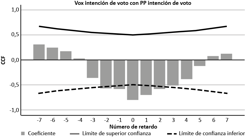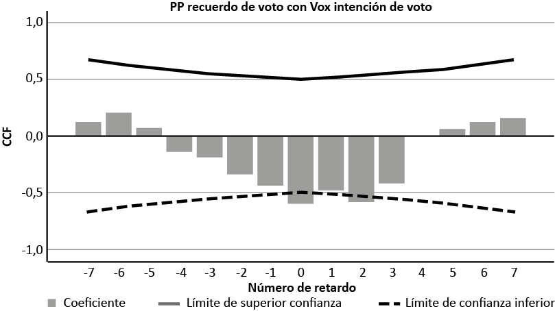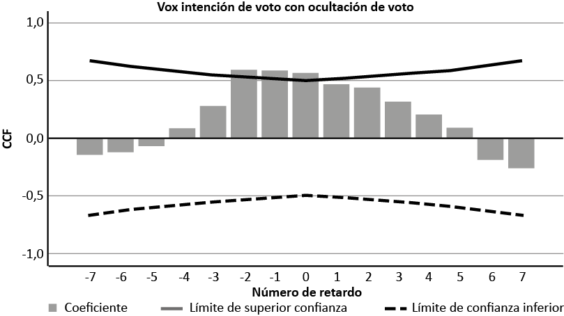 Las evidencias a favor de dicha hipótesis se encuentran en la correlación cruzada entre la intención de voto a Vox con la ocultación de voto, el recuerdo de voto y la intención de voto al PP. Los entrelazamientos entre el recuerdo de voto al PP, la ocultación de voto, su intención de voto y las intenciones de voto a Vox son estadísticamente significativas. Cabe destacar que, si bien la intención de voto al PP precede a la intención de voto a Vox, lo que indica una dinámica de trasvase en el tiempo de votantes del PP hacia Vox, la relación positiva en retrasos positivos sugiere cierta reversibilidad en este cambio de preferencia.